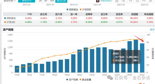 国联基金,目前总规模1385亿元,由国联证券持股75.5%,在北京东城区办公,近三年收益9%,近1年收益3.52%,业绩整体上还可以。不过,2025年一季度该公募规模少了176亿,去年年底尚有1560亿。