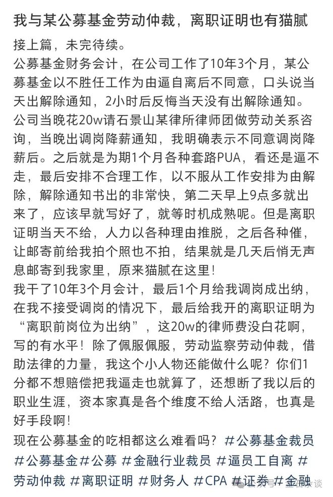 3)10年老财务不同意调岗降薪,然后公募进行了为期一个月的各种套路pua,看还是逼不走,最后安排不合理工作,以不服从工作为由进行了解除。