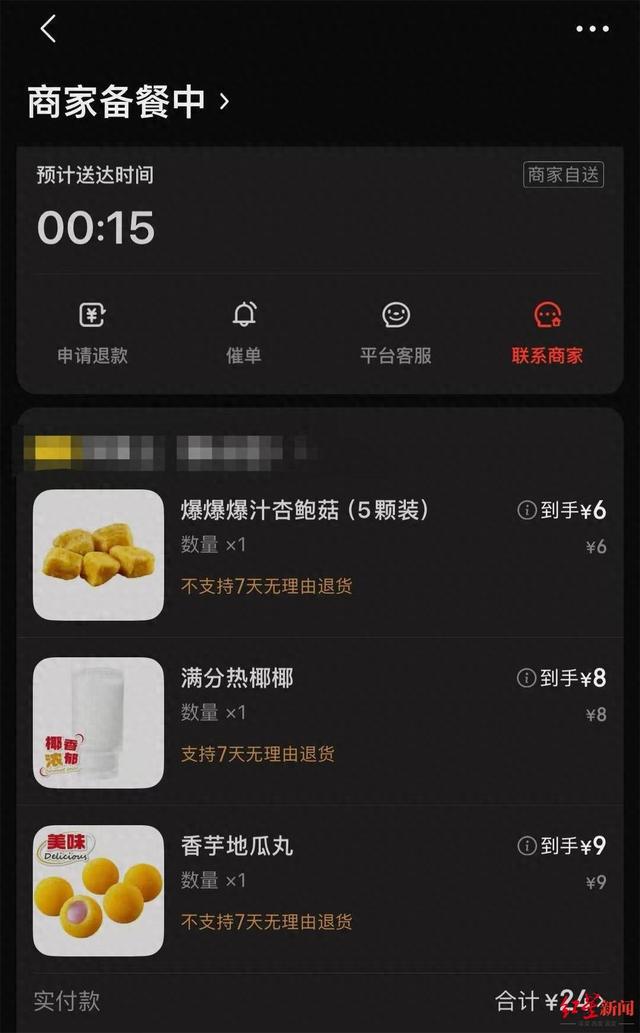 5月1日23时23分,徐先生通过京东外卖选了一家快餐连锁店——华莱士(象山店),买了爆汁杏鲍菇、香芋地瓜丸和一杯热椰,共计24元。下单后,系统很快显示商家已经接单、商品备餐中,预计送达时间为0点15分。