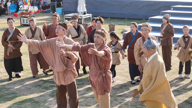 人群中,白须飘舞、手托寿桃的“寿星”扮演者格外引人注目,饰演者岳绍俊脱下戏服后,真实身份是一位地地道道的农民:“朋友介绍来这参与了,来这把我选上演老寿星。平常我们的导演对我们非常严厉,教我们的动作必须得按规矩学会,所以说我们现在也努力去把它学好,今天看见这么多人看我们,我心里很激动,终于当演员了。”