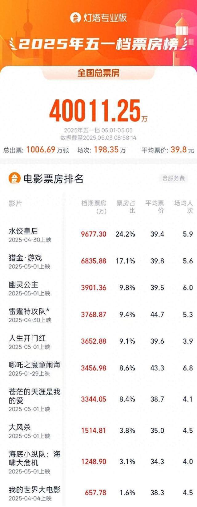 2025年五一档电影票房破4亿 访客 2025-05-03 173 抢沙发 默认 据网络平台,截至5月3日8时58分,2025年五一档(5月1日—5月5日)档期内总票房(含预售)突破4亿,影片《水饺皇后》《猎金·游戏》《幽灵公主》暂列前三名。来源:央视新闻 标签: 档期 水饺 海报 阅读 QQ 分享 微博分享 微信分享 分享 上一篇逛博物馆、游西湖……“五一”假期多地旅游市场热度高涨 下一篇法庭笔记:“摩打食堂”遭一烤肉店冒用 法院:构成商标侵权 逛博物馆、游西湖……“五一”假期多地旅游市场热度高涨上一篇 法庭笔记:“摩打食堂”遭一烤肉店冒用 法院:构成商标侵权下一篇 相关推荐 档期水饺 恒生中国企业指数成分股概览 2025-12-19 白银价格行情最新分析概览 2025-12-19 焦炭,定义与概述 2025-12-19 黄金期货交易时间规则详解 2025-12-19 广发期货合法性探讨 2025-12-19 焦煤期货手续费高昂,一手达二百多元 2025-12-19 股指期货与期权的差异解析 2025-12-19 股指期货每日交易次数详解 2025-12-19 发表评论取消回复 快捷回复: 评论列表 (暂无评论,173人围观)参与讨论 还没有评论,来说两句吧...