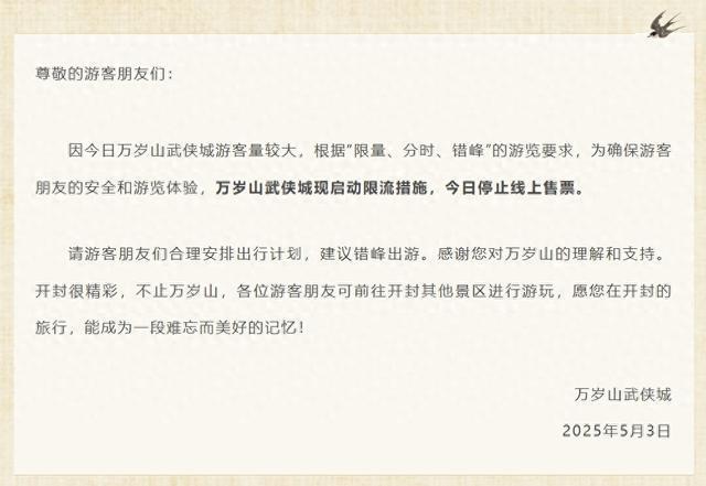 因5月3日万岁山武侠城游客量较大,根据“限量、分时、错峰”的游览要求,为确保游客朋友的安全和游览体验,万岁山武侠城现启动限流措施,今日停止线上售票。