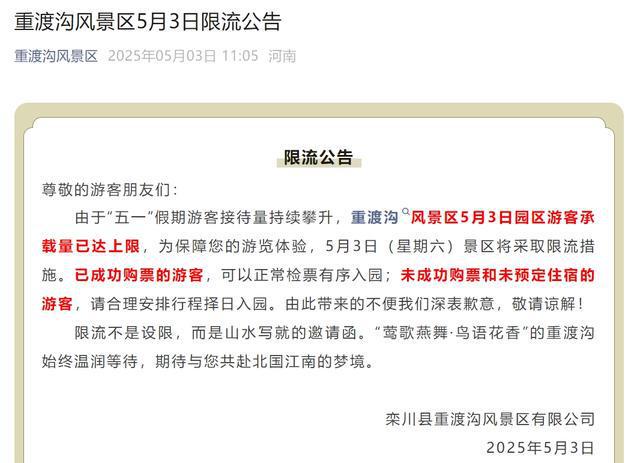 由于“五一”假期游客接待量持续攀升,重渡沟风景区5月3日园区游客承载量已达上限,为保障您的游览体验,5月3日(星期六)景区将采取限流措施。已成功购票的游客,可以正常检票有序入园;未成功购票和未预定住宿的游客,请合理安排行程择日入园。