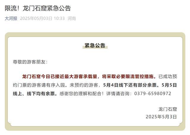 龙门石窟5月3日已接近最大游客承载量,将采取必要限流管控措施。已成功预约门票的游客请有序入园。未预约的游客,5月4日线下还有部分余票。5月5日线上、线下均有余票。