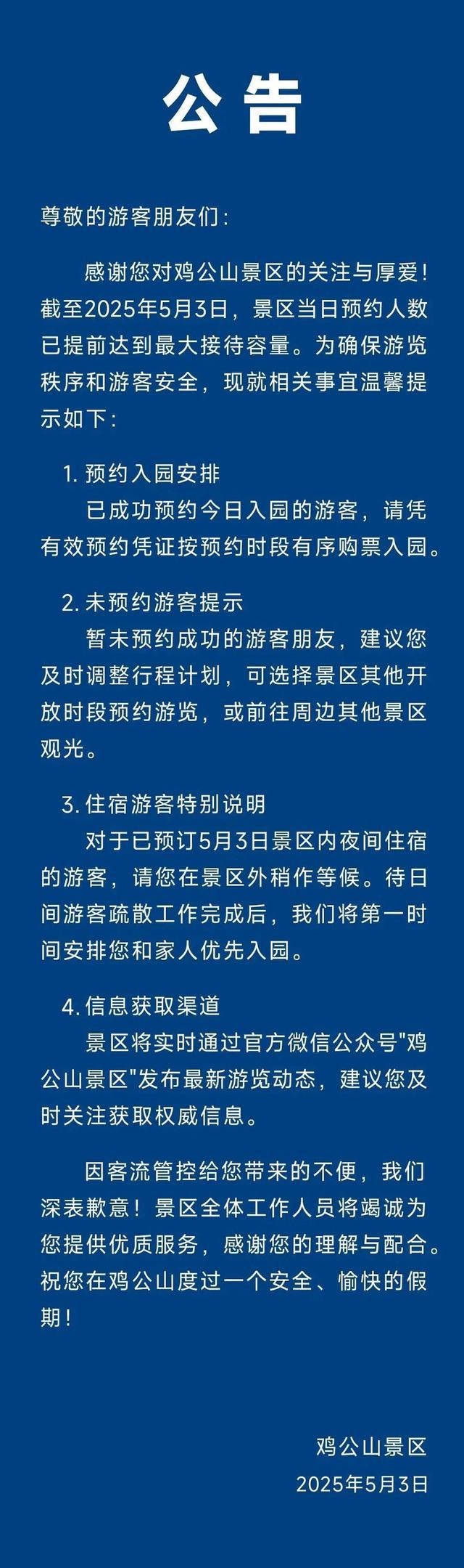 截至2025年5月3日,景区当日预约人数已提前达到最大接待容量。暂未预约成功的游客朋友,建议您及时调整行程计划,可选择景区其他开放时段预约游览,或前往周边其他景区观光。