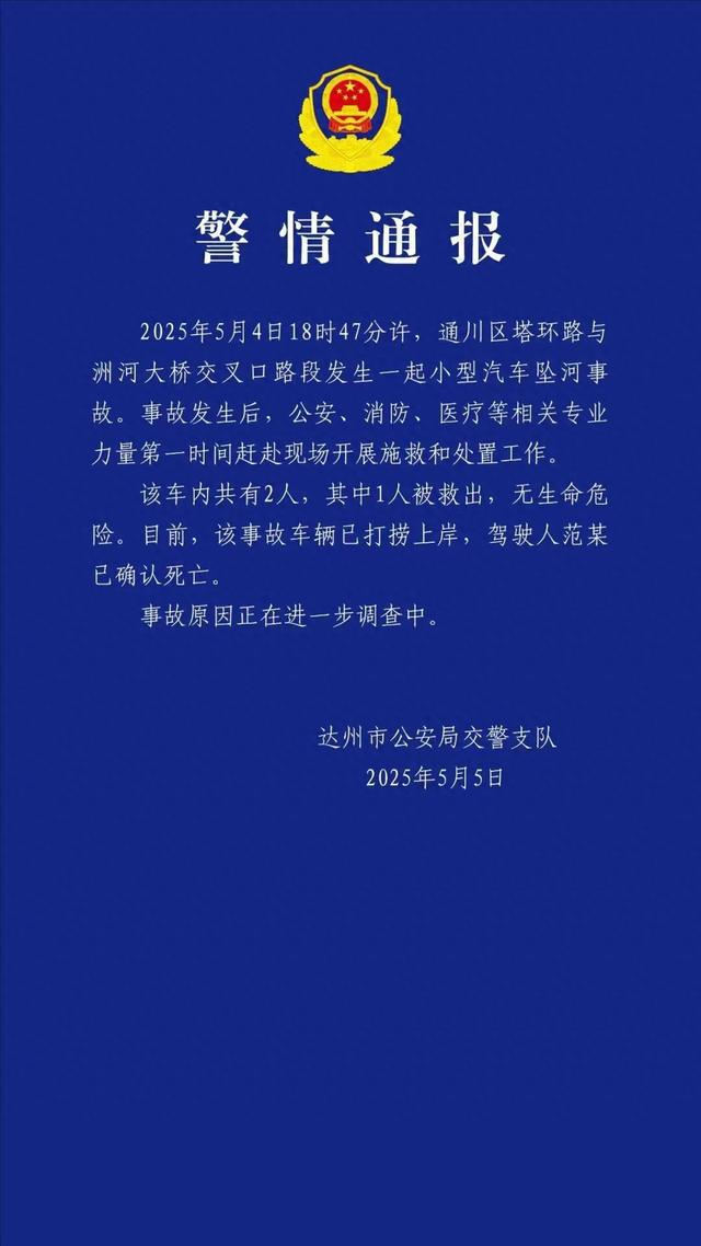 达州警方通报“一小型汽车坠河事故”:驾驶人范某已确认死亡