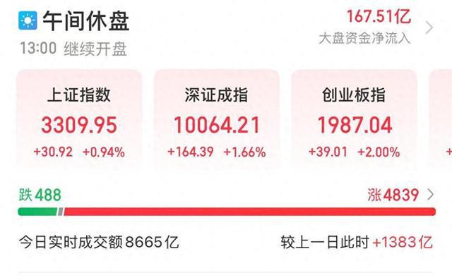 5月6日,五月第一个交易日,A股三大指数早盘集体上涨,截至午盘,沪指涨0.94%,深成指涨1.66%,创业板指涨2%,北证50指数涨2.77%。全市场半日成交额8665亿元,较上日放量1383亿元。全市场超4800只个股上涨。