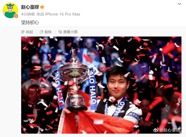 赵心童在评论区回应:“谢谢晖哥当年的坚持与突破,让我们今天能站在更宽的跑道上继续奔跑。”随后,赵心童在社媒发布自己捧杯的照片,配文写道:坚持初心。