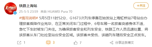 5月5日深夜,铁路上海站微博发布情况通报,5月5日11时52分,G1673次列车停靠在始发站上海虹桥站7号站台办理旅客乘降作业完毕,在正常关闭车门过程中,6号车厢一名旅客突感身体不适,急忙下车时被车门夹住。为确保旅客安全和列车安全,铁路工作人员迅速处置,将该旅客从车门处拉至站台安全区域。该旅客未受伤,该趟列车随后安全正点发车。
