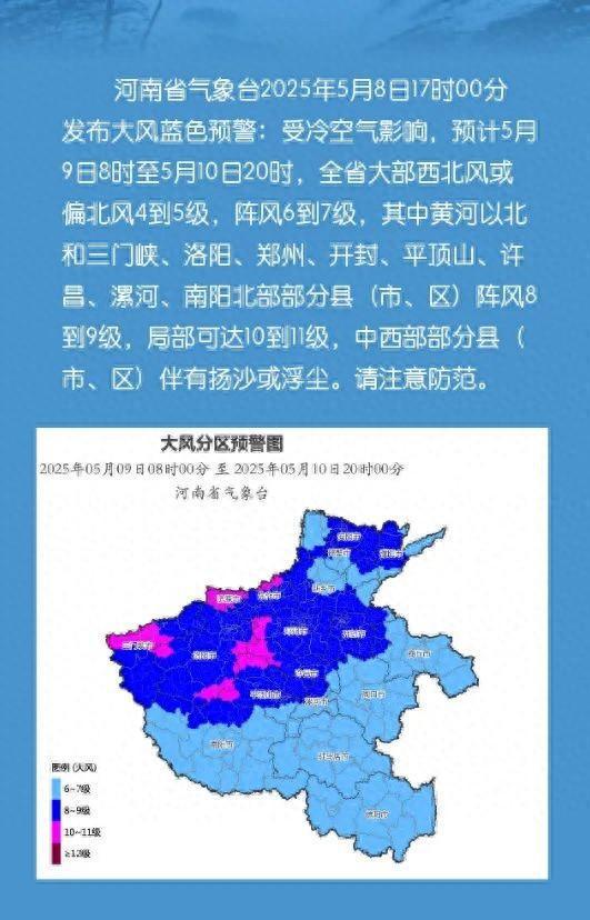 当前,河南省大风蓝色预警生效中,今天下午到明天白天,全省有4级左右西北风或偏北风,阵风6到7级,北部、中西部部分县市8到9级,局部10到11级,西部伴有扬沙或浮尘;外出注意关紧门窗,加固临时搭建物,外出远离广告牌等临时搭建物,避开高楼之间的狭窄通道,谨防风力突然增大。