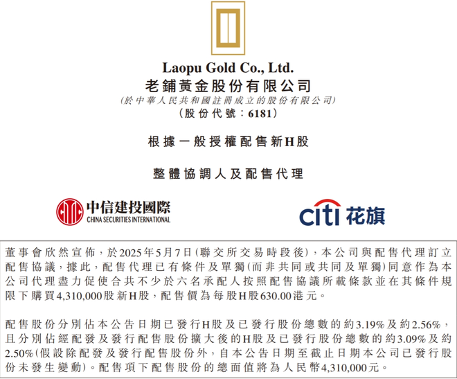 5月8日,知名珠宝商老铺黄金公告,拟以每股630港元的价格配售431万股新H股,净筹约26.98亿港元。