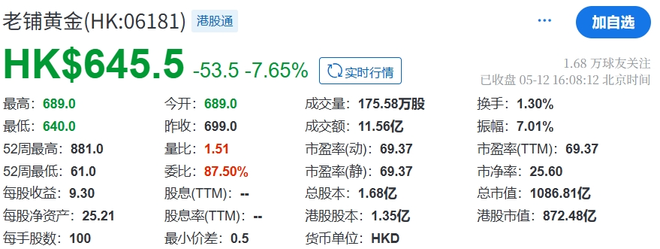 但截至港股收盘,受市场消息影响,老铺黄金报645.5港元/股,跌幅高达7.65%。