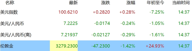 下午2点37分,伦敦金报每盎司3279.23美元,下跌了1.42%,但年初至今仍还有近25%的涨幅。