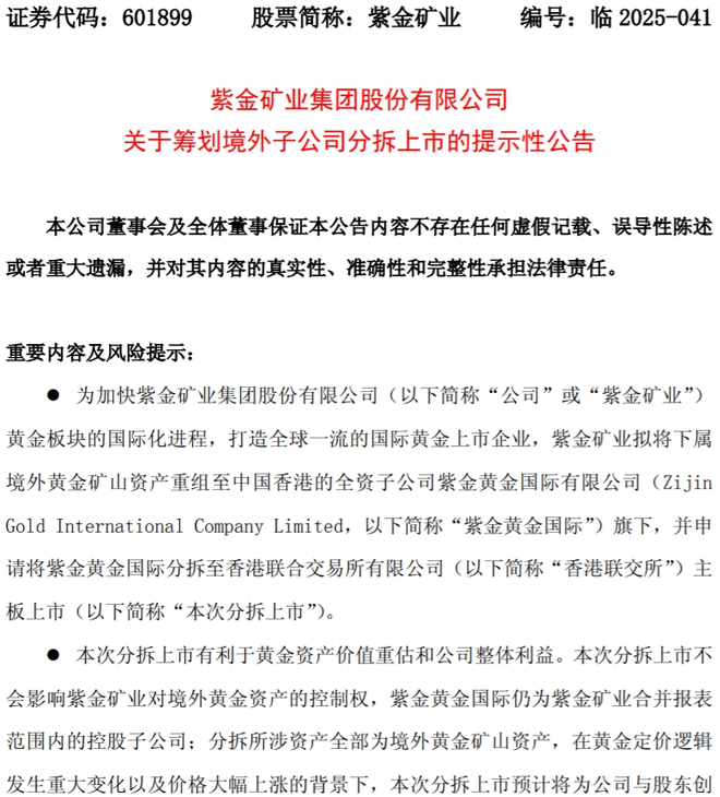 紫金矿业称:“分拆所涉资产全部为境外黄金矿山资产,在黄金定价逻辑发生重大变化以及价格大幅上涨的背景下,本次分拆上市预计将为公司与股东创造更大价值。”
