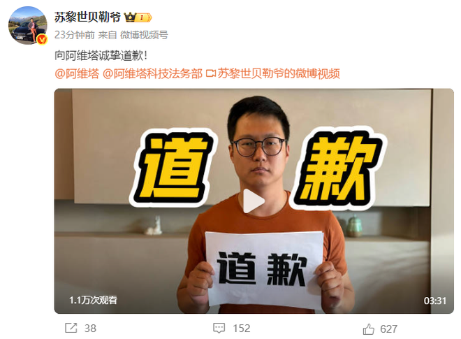 本以为随着博主的道歉,这件事就彻底划上了句号。没想到,5月13日下午,阿维塔发文称,“苏黎世贝勒爷”的道歉视频中存在断章取义、偷换概念,已正式对其提起民事诉讼,并索赔1000万的经济与商誉损失。