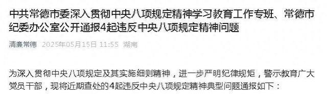 5月15日,中共常德市委深入贯彻中央八项规定精神学习教育工作专班、常德市纪委办公室公开通报4起违反中央八项规定精神问题。