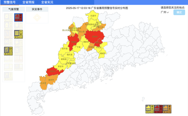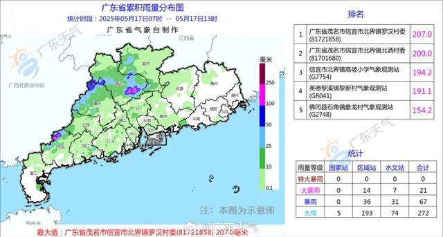 据气象水文监测,5月17日7时到5月17日13时,广东省有9个镇街录得超过100毫米的大暴雨,有18个镇街录得50毫米~100毫米的暴雨,有91个镇街录得25毫米~50毫米的大雨。各市雨量最大的镇街有:茂名信宜市北界镇207毫米、清远英德市黎溪镇191.1毫米、肇庆怀集县下帅壮族瑶族乡113.8毫米、广州从化区鳌头镇70.3毫米、韶关曲江区罗坑镇57.7毫米。