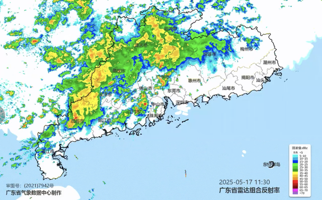 5月17日11时许,@广东天气 发布的雷达图显示,大半个广东都泡在水里。其中,英德、信宜等地发布了暴雨红色预警信号。