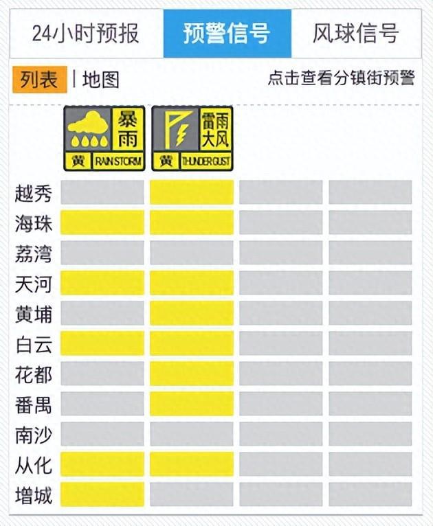 截至17日13时40分,广州多区雷雨大风黄色预警信号生效,海珠区、天河区、白云区、从化区、增城区还发布了暴雨黄色预警信号。