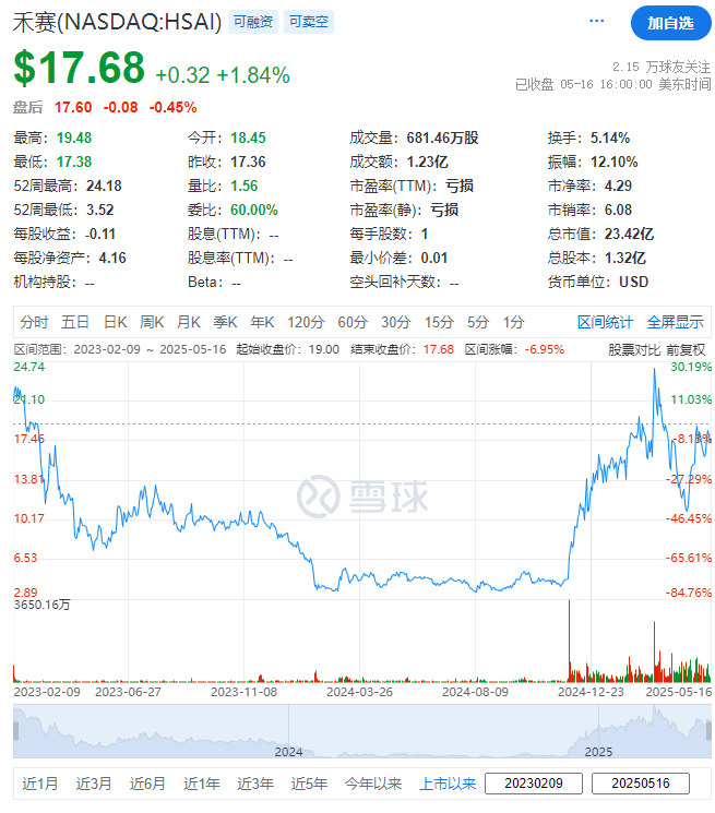禾赛科技,于2023年2月9日在美国纳斯达克挂牌上市,当时以每股ADS发行价19.00美元发行1,000万股ADS,融资1.90亿美元。截至2025年5月16日收市,每股报17.68美元,总市值约23.42亿美元。