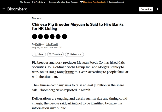 传牧原股份寻求赴港IPO募资10亿美元,中信、高盛、大摩助力