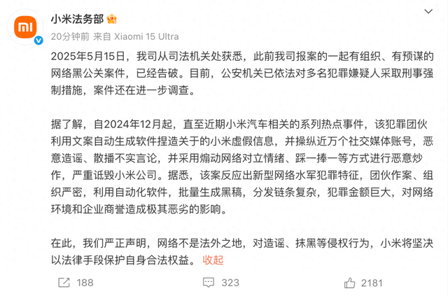 @小米法务部 称,自2024年12月起,直至近期小米汽车相关的系列热点事件,该犯罪团伙利用文案自动生成软件捏造关于小米的虚假信息,并操纵近万个社交媒体账号,恶意造谣、散播不实言论,并采用煽动网络对立情绪、踩一捧一等方式进行恶意炒作,严重诋毁小米公司。