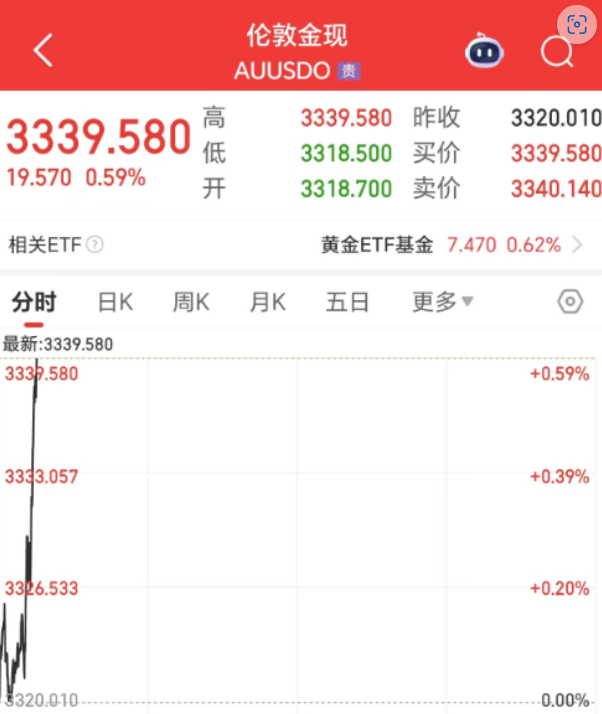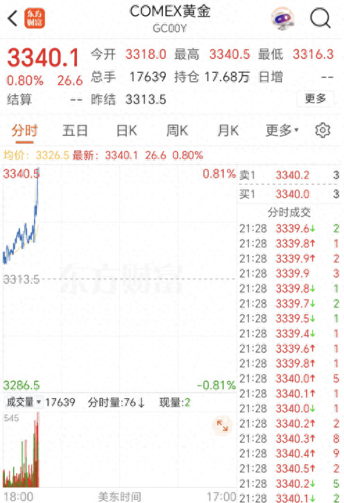 5月22日,现货黄金盘中再次出现急拉。刚刚,COMEX(纽约商品交易所)黄金一度冲破3340美元,涨幅超0.8%。