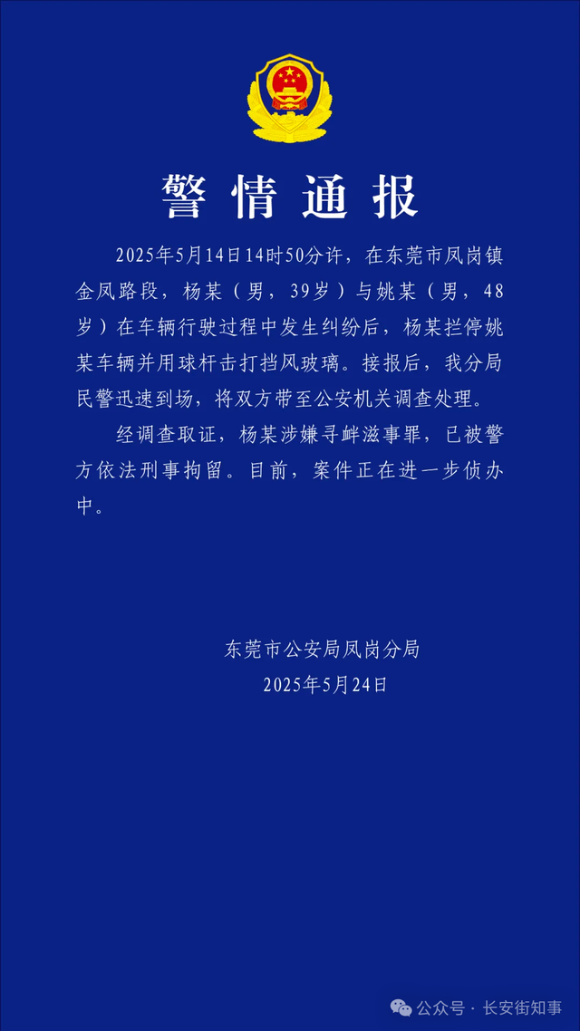 5月24日,东莞市公安局凤岗分局发布“警情通报”称,此事发生于5月14日,司机杨某涉嫌寻衅滋事罪,已被刑拘。