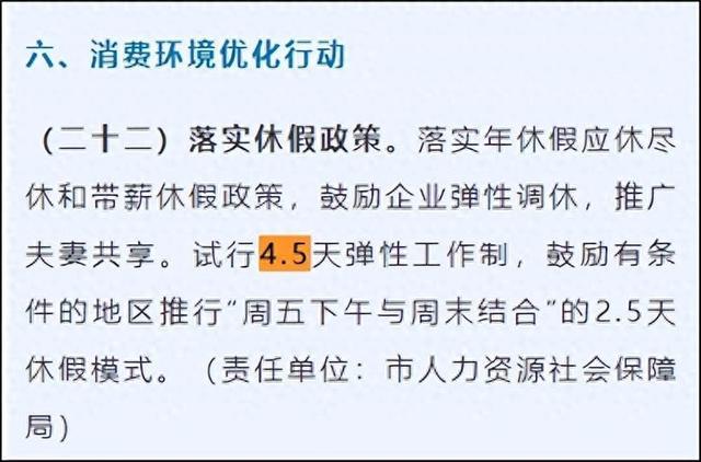 2020年3月,浙江省也曾印发《浙江省人民政府办公厅关于提振消费促进经济稳定增长的实施意见》,鼓励实施一周4.5天弹性工作制,支持有条件的机关、社会团体、企事业单位落实带薪休假制度。