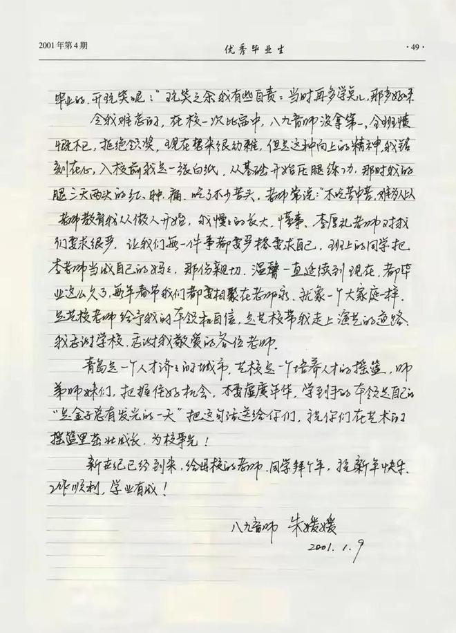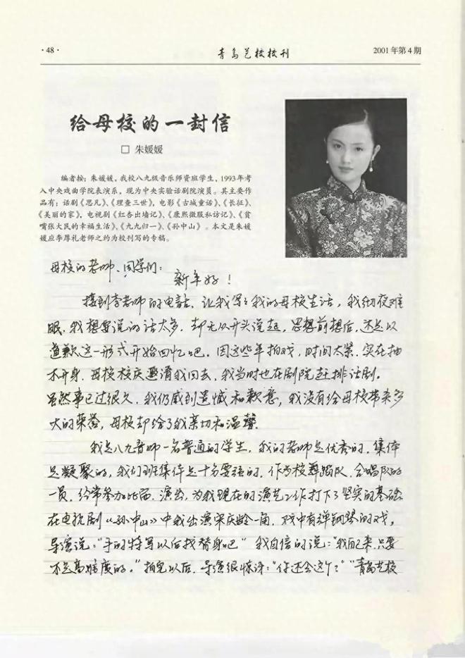 其实认识朱媛媛的人都知道,她演戏好那是公认的。中戏科班出身,正儿八经在舞台和镜头前打磨出来的功底,不管是正剧还是生活剧,往那儿一站就是角色本身。今天,有网友翻出了她给青岛母校写的一封信,才发现这人藏着这么大的惊喜——字写得太漂亮了!不是那种刻意秀技巧的书法,而是随手写来都透着娟秀劲儿,一笔一划像春天的柳条似的,看着就舒服。有人说看她的字就像闻见一股淡香,满纸都是从容的味道,不像现在有些名人写字,看着花里胡哨,实则透着着急劲儿。