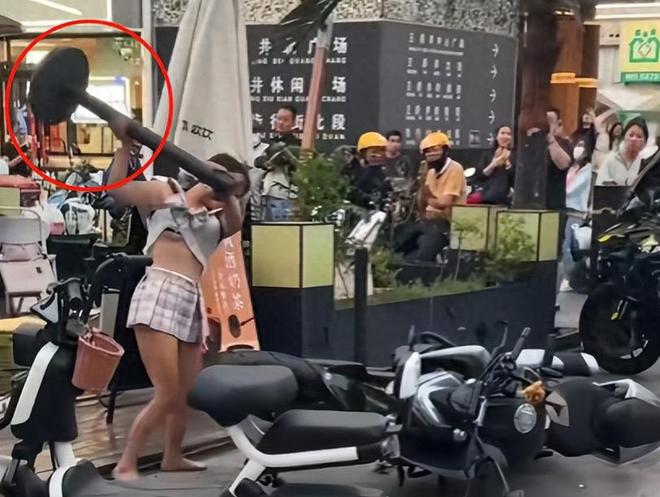 眼看树枝砸不烂车,她直接上手掰后视镜,又抱起奶茶店门口十多斤重的铁柱子,跟抡锤子似的砸车轮子。金属碰撞的声音特别刺耳,砸了五六下她自己都累得直喘气,这时候大家才发现她的高跟鞋扔在路边——细高跟确实不适合干这“体力活”。更吓人的是她从包里摸出打火机,蹲在车边对着油箱一顿鼓捣,又是点管线又是点轴承,折腾了十分钟愣是没点着,周围人吓得够呛,愣是没人敢上前拦着。