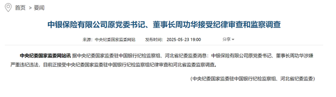 5月23日,据中央纪委国家监委驻中国银行纪检监察组、河北省纪委监委消息:中银保险有限公司原党委书记、董事长周功华涉嫌严重违纪违法,目前正接受中央纪委国家监委驻中国银行纪检监察组纪律审查和河北省监委监察调查。