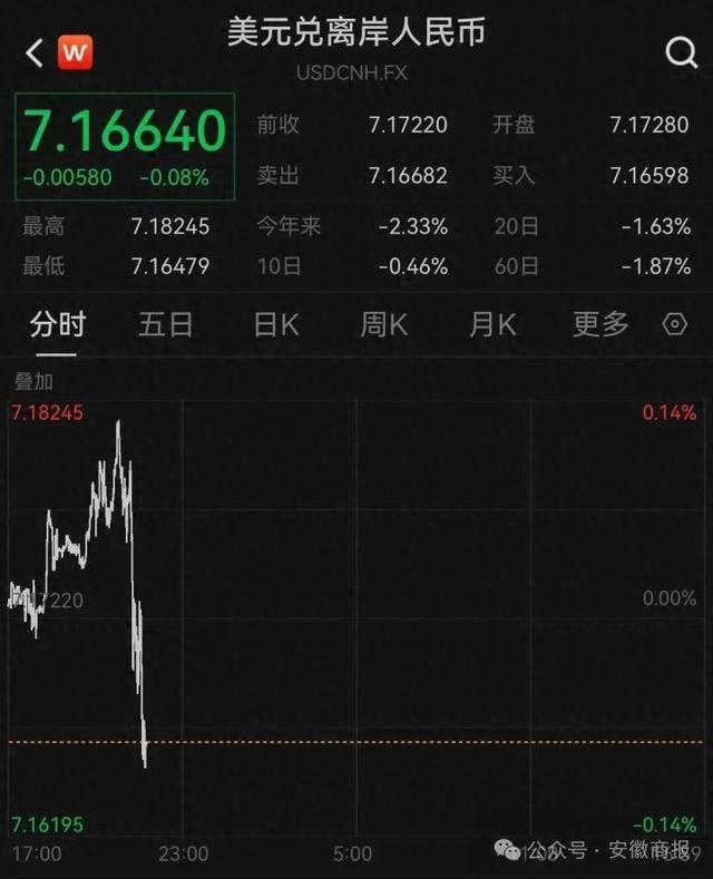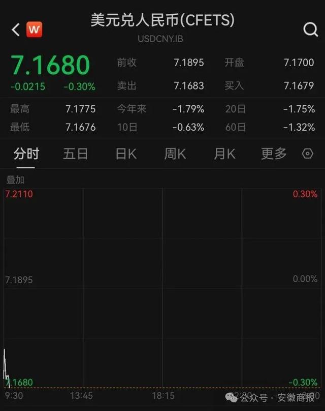 在岸银行间外汇市场上,人民币对美元汇率同样大涨。Wind数据显示,截至9:50,在岸人民币对美元汇率报7.1680元,较前收盘价涨215个基点,盘中最高报7.1676元。