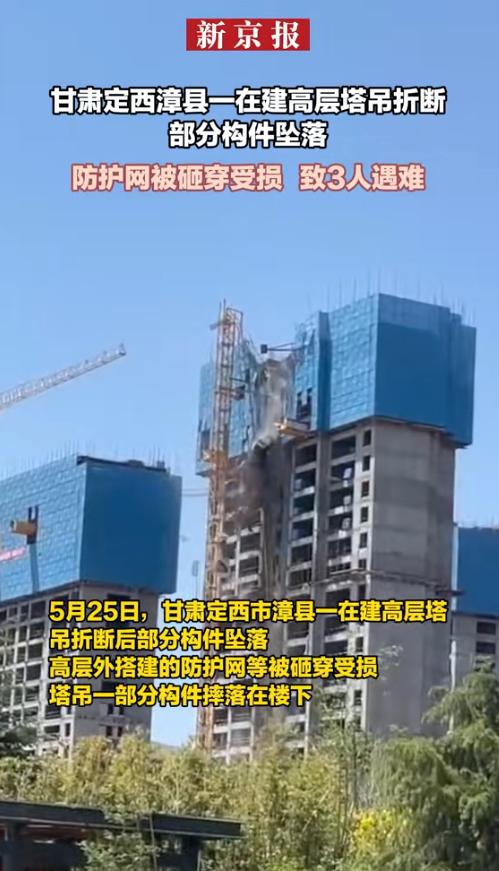 甘肃定西这场塔吊事故,真是让人看了心头发紧!5月25号下午,漳县一个在建高楼工地上,塔吊突然拦腰折断,带着三个施工人员从25层楼直接砸下来。视频里那场面太吓人了——楼板被砸穿的瞬间,钢筋水泥块子跟下雨似的往下掉,谁能想到这眨眼功夫就没了三条人命?更让人心堵的是,有家属在评论区哭着说:"我哥才刚到工地两天啊..."