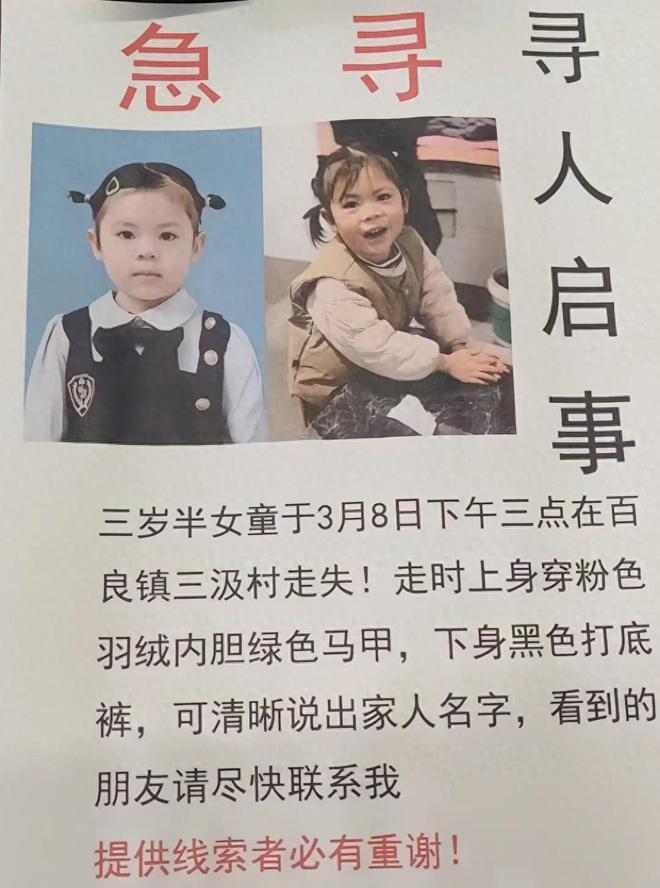 说起这个走失的小姑娘,事情还得回溯到去年春天。3月8号下午三点多,陕西渭南合阳县百良镇三汲村的曹乐琪,在自家门口玩的时候突然不见了。家里人急疯了,发动全村人找了个遍。从寻人启事上看,孩子走失时穿着粉色羽绒内胆、绿色马甲,黑色打底裤,而且已经能清楚地说出爸爸妈妈的名字。
