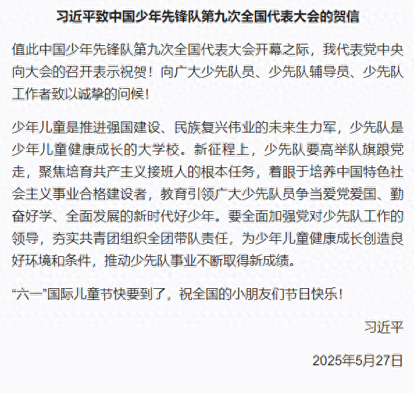 “六一”国际儿童节即将到来之际,中国少年先锋队第九次全国代表大会27日上午在京开幕。中共中央总书记、国家主席、中央军委主席习近平发来贺信,代表党中央向大会的召开表示祝贺,向广大少先队员、少先队辅导员、少先队工作者致以诚挚的问候,并祝全国的小朋友们节日快乐。