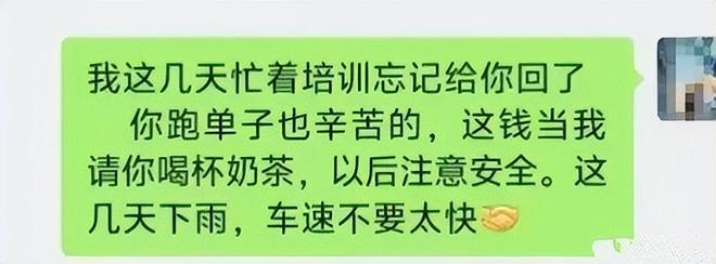 更有意思的是后续。到了5月20号那天,小哥刚发工资,第一时间就给女交警转了40块钱罚款,消息框里写着:“姐,工资到了,赶紧还你,谢谢您那天的奶茶钱。”结果女交警没收,回了句:“这钱留着买双防水鞋吧,看你鞋都磨破了。这几天下雨,骑车别压井盖,容易打滑。”您说这事儿办得多敞亮?不是冷冰冰的“罚款-交钱”,而是把人当自家人似的惦记着。