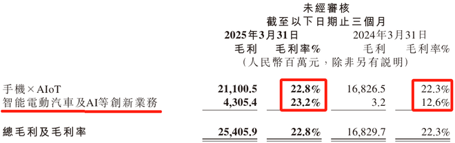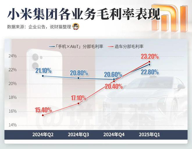 今年Q1,小米造车毛利率为23.2%,「手机×AIoT」毛利率为22.8%。