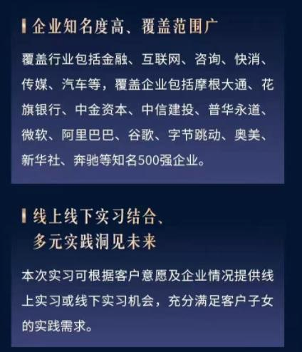 上述实习计划宣传图片显示,可以为客户子女提供金融、互联网、咨询、快消、传媒、汽车等行业的实习机会,其中不乏摩根大通、中金资本、谷歌、微软、字节跳动等知名企业。