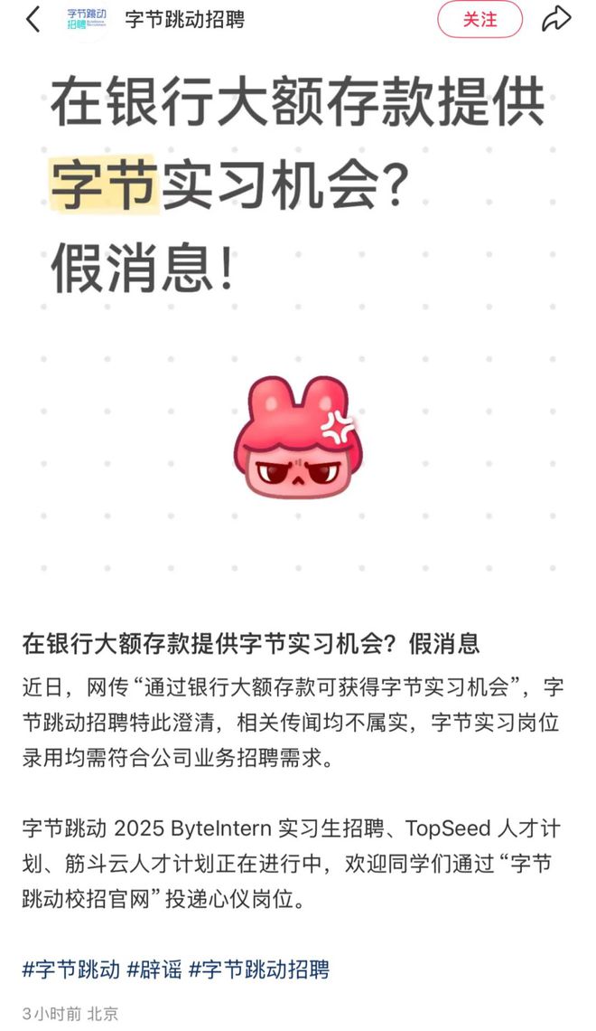 针对该消息,字节跳动招聘官方账号今日澄清称:“相关传闻均不属实,字节实习岗位录用均需符合公司业务招聘需求。”