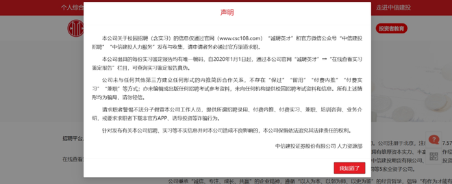 此外,实习计划中提及的中信建投在其官网“诚聘英才”一栏挂出的长期声明显示,该券商未与任何其他第三方建立任何形式的内推简历合作关系。