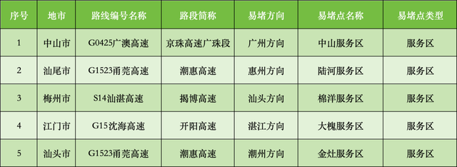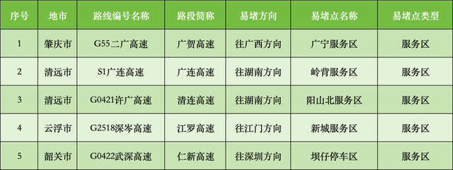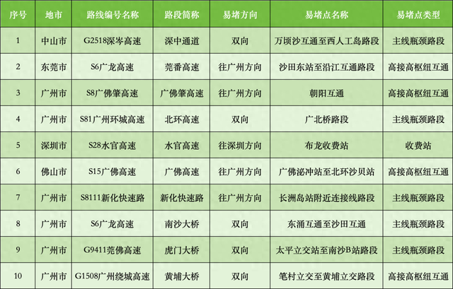 经研判,今年广东端午节期间较为拥堵的路段包括G2518深岑高速万顷沙互通至西人工岛路段、S6广龙高速沙田东站至沿江互通路段等10处,车流繁忙服务区包括G55二广高速的广宁服务区、S1广连高速的岭背服务区等5处,充电繁忙的服务区则包括G0425广澳高速的中山服务区、G1523甬莞高速的陆河服务区等5处(详见下表)。