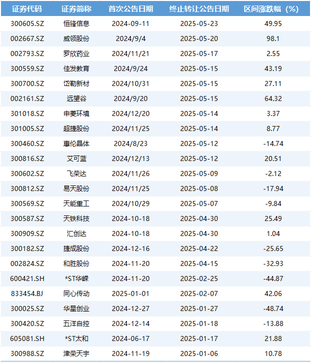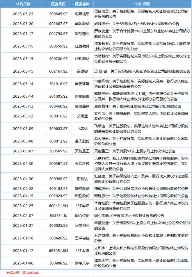 从转让进度来看,部分终止协议转让的公司,并未取得交易所确认书,也就无法完成相关股份的过户登记手续。比如恒锋信息(300605.SZ)在5月23日公告中指出,该公司控股股东、实际控制人魏晓曦、欧霖杰于去年9月10日与程文宏签订股份转让协议,但直到公告披露日,协议转让事宜仍未取得深交所确认书,未完成股份过户登记手续,双方协商后终止了协议转让。