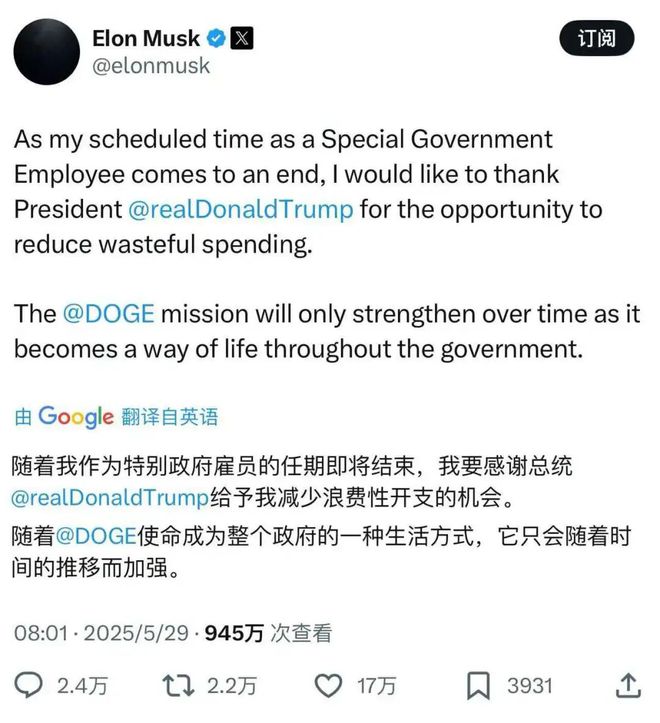 今天早上,马斯克在其社交媒体平台X上宣布:在他作为特别政府雇员的任期即将结束。