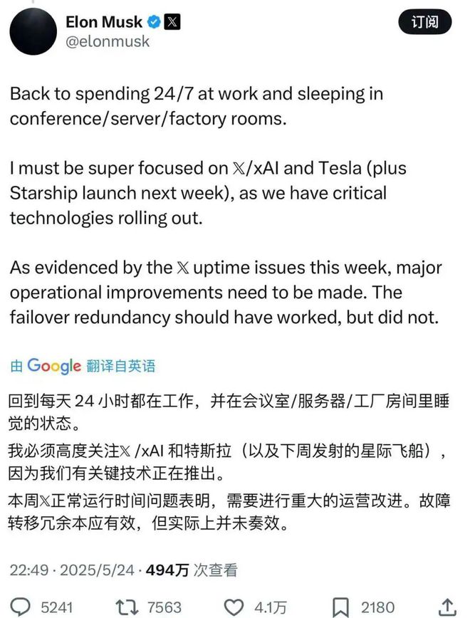 值得注意的是,前不久,马斯克就在X上发文表示,自己已经回到以前那种“一周七天、每天24小时”都在工作,或在会议室、服务室、工厂房间里睡觉的状态。