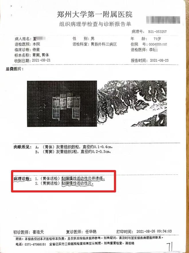 手术前还有个插曲:医生让先花1600块买手术意外险,不然不给签字。交了钱签了字,2021年8月26号手术就做了。不到半小时,医生就端出整个切下来的胃,说确定是胃癌,全切了。可术后连个冰冻病理检查都没做,这可是确定肿瘤良恶性的关键啊!后来两次病理检查都显示是胃炎,出院诊断上也写着胃炎和胃溃疡。