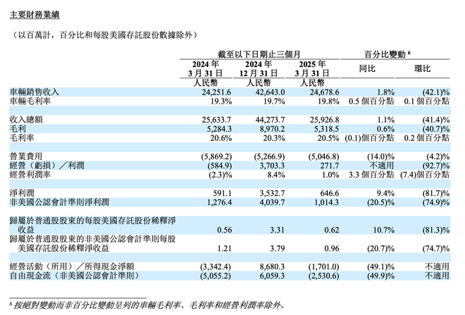 5月29日,理想汽车(02015.HK, LI.US)发布2025年第一季度业绩。期内,其累计交付新车9.3万辆,同比增长15.5%;实现总营收259.27亿元,同比增长1.1%;净利润6.47亿元,同比增长9.4%,连续10个季度盈利。截至第一季度末,该公司现金储备为1107亿元。在既有产品推进换代的同时,理想汽车纯电车型的上市进程也按下加速键。理想汽车董事长兼CEO李想在同日晚间举办的业绩电话会中表示,理想纯电SUV上市筹备工作进展顺利,其中理想i8将于今年7月正式发布,理想i6将于9月发布。目前理想i8的测试车正在全国各地路测,进行量产前的优化,累计测试里程已经突破950万公里。尽管处于新旧产品切换阶段,理想汽车的毛利率仍维持在相对稳定水平。具体来看,2025年第一季度整体毛利率为20.5%,与2024年第一季度的20.6%基本持平,较2024年第四季度的20.3%略有回升;同期车辆毛利率分别为19.8%、19.3%和19.7%,同样保持稳定态势。4月上海车展期间,2025款理想MEGA正式上市,其中支持座椅旋转的home版本售价55.98万元(较焕新版MEGA Ultra售价高3万元),并于5月23日开启全国交付。李想在业绩电话会上透露,自MEGA home发布以来,MEGA系列超90%的订单来自home版本。此外,理想汽车L系列也于5月8日完成焕新上市。在交付能力建设上,为保障MEGA系列的交付节奏,理想汽车北京工厂与供应链体系正加速产能提升,预计7月交付量将达到2500-3000辆。4月,理想汽车交付新车3.39万辆,同比增长31.6%。叠加第一季度交付量计算,今年前4个月,理想汽车累计交付新车12.68万辆,同比增长19.41%。当被问及今年的销量目标时,邹良军说,管理层希望理想汽车2025年的销量增速会是20万元及以上新能源市场汽车市场销量增速的两倍。据他介绍,近期理想汽车公布的“百城繁星计划”就将帮助其加强在四五线城市的覆盖。自去年9月在试点城市四川自贡和达州开业门店以来,理想汽车在不到半年的时间里,在当地20万以上乘用车市场中取得了28%的市占率;其在陕西延安20万以上乘用车市场的覆盖率也达到了25%。同时,理想L6车型的推出,也让理想汽车在四五线城市看到了更大的市场机会。在扩大销售网络的同时,理想汽车是否会扩展其产品类型,包括是否会推出轿车产品也广受外界关注。对此,李想表示:“我们认为,增程SUV、纯电SUV以及理想MEGA全部开启交付后,可以支持理想汽车实现年度3000亿人民币的营收规模。在实现这个规模的基础之上,我们会根据真实的市场需求,推出价格更合适的MPV和轿车产品,这些产品也会满足中国以及其他亚洲和欧洲市场的需求。”