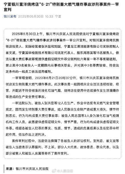 2025年5月30日上午,银川市兴庆区人民法院依法对宁夏银川富洋烧烤店“6·21”特别重大燃气爆炸事故涉刑事案件一审公开宣判。对银川富洋烧烤民族街店投资人、实际经营者张洪显和刘国,宁夏龙江清洁能源有限公司实际控制人崔文波,宁夏国华检测技术有限公司法定代表人、股东周志国等15名被告人,依法以重大责任事故罪或提供虚假证明文件罪分别判处六年至一年不等有期徒刑,禁止其中3名被告人一定期限内从事相关职业,并对其中3名罪责较轻、符合法定条件的一线员工依法适用缓刑。