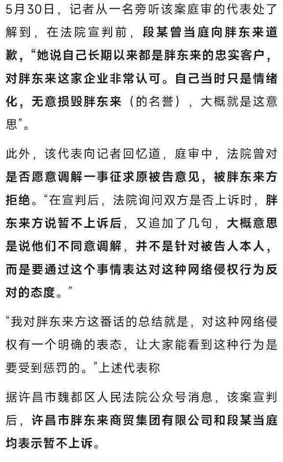 5月28日,许昌市魏都区人民法院公开审理了该案,并当庭宣判,判决段某在其个人抖音账号“两个小段(小)”发布宣读书面道歉信的视频,30日内不得删除,并赔偿胖东来各项经济损失400000元。