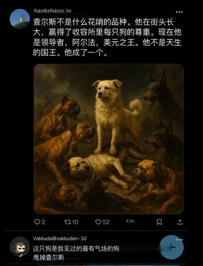 今天,跟大伙儿聊一件新鲜事儿,最近,全球网民都在追一只中国狗,被称为世界唯一“狗王”!这事儿说起来也奇了怪了——河北有个网名叫“胡子大叔爱犬部落”的铲屎官,家里养了十多只狗,其中一只叫“长毛”的小狗,就因为一段20多秒的视频,突然就火出圈了,现在外国网友给它起名“查尔斯国王”,据说身价都炒到10万美金了,这阵仗连狗主人都没整明白咋回事儿。